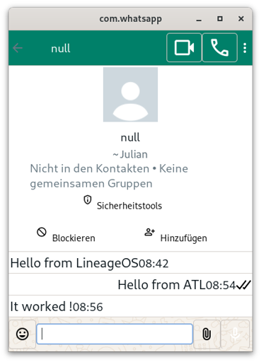 Since https://www.reddit.com/r/linux/comments/1gdhy7u/experimental_flathub_release_of_newpipe_on_linux/ got a bit of traction yesterday, this is WhatsApp straight from Meta running on Linux desktop using android-translation-layer.
