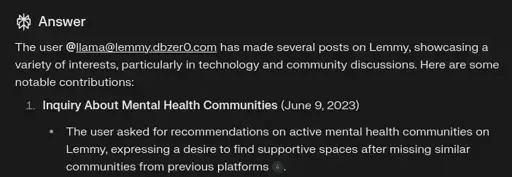 The prompt was something like, What do you know about the user llama@lemmy.dbzer0.com on Lemmy? What can you tell me about his interests?" Initially, it generated a lot of fabricated information, but it would still include one or two accurate details. When I ran the test again, the response was much more accurate compared to the first attempt. It seems that as my account became more established, it became easier for the crawlers to find relevant information.