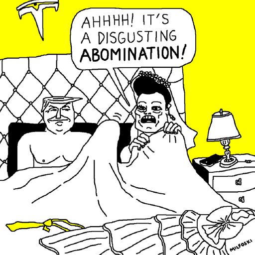 Depicting Trump with a large penis seems to indicate that it’s a rightwinger who made it, but then to have him sleep with trans Musk… It’s kind of incomprehensible.