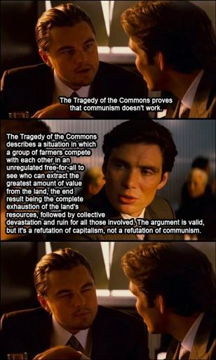 The tragedy of commons straight up describes capitalism, profits are privatized and costs are socialized, how can people think this is a refutation of communism.