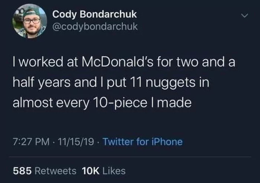 I worked at KFC and would always cook more chicken than we expected to sell. Almost everyone was a broke af student, plenty sharing houses with other broke af students. The trick was figuring out the max to cook without raising suspicion, or have an excuse ready like, “There’s X event on finishing at 9 so well probably get a small rush.”