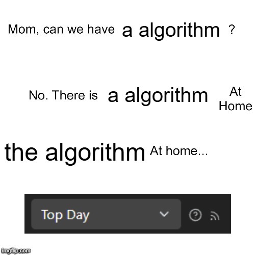 gerald_eliasweb@reddthat.com to memes@lemmy.worldEnglish · 8 days agoWe have a algorithim at homereddthat.comimagemessage-square46linkfedilinkarrow-up1423