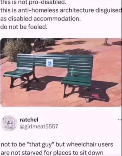 minus-squareFedizen@lemmy.worldlinkfedilinkarrow-up54·17 days agoBut not two disabled people. Alas, this bench discriminates.