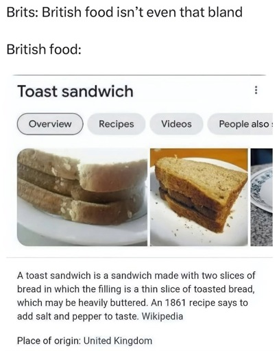 minus-squareMrMetaKopos@slrpnk.netlinkfedilinkEnglisharrow-up9·13 days agoPoor… And not normal poor, but wartime poor. It was invented by Heinz to sell beans in England.