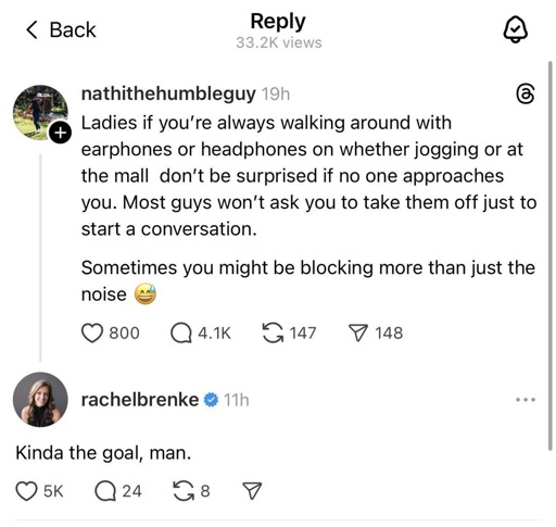 I hate this though because I am not just trying to say hi, I am literally trying to explain to women why they should listen to me, so if they have headphones in they will never hear the arguments in the first place that I have honed in preparation through conversations with my AI Wives.