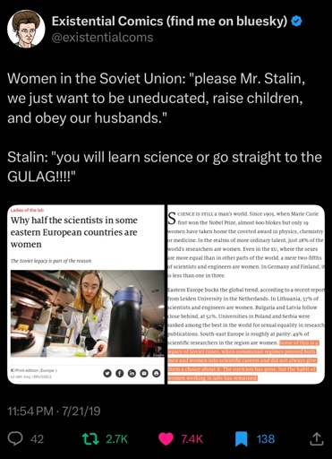 No doubt the Soviet Union was a huge step forward for women but this is just a dumb thing to say. Women doing unpaid household labour and emotional labour has always been the case.