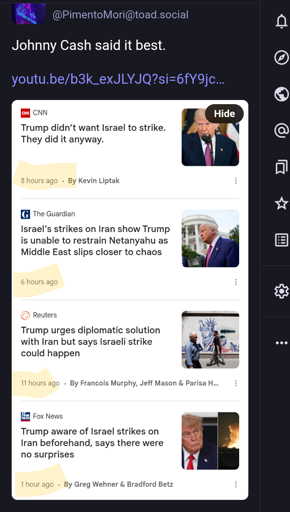 2·6 months agoI’m not defending cluster bombs, I’m saying it’s bullshit to kill multiple families in an apartment building and pretend you’re the fucking good guys because you have more sophisticated tech. Especially when there was no reason to attack Iran like this in the first place.
